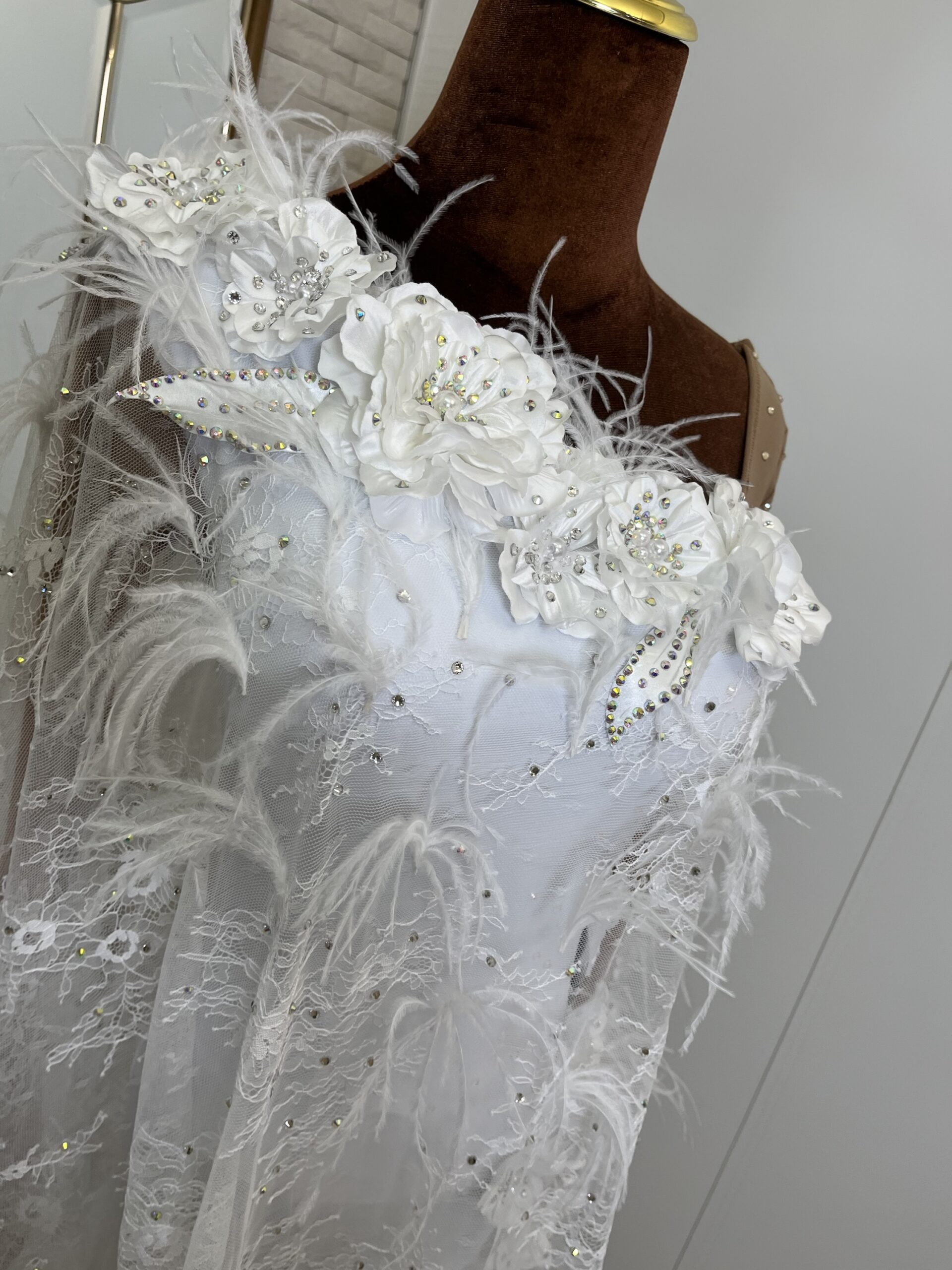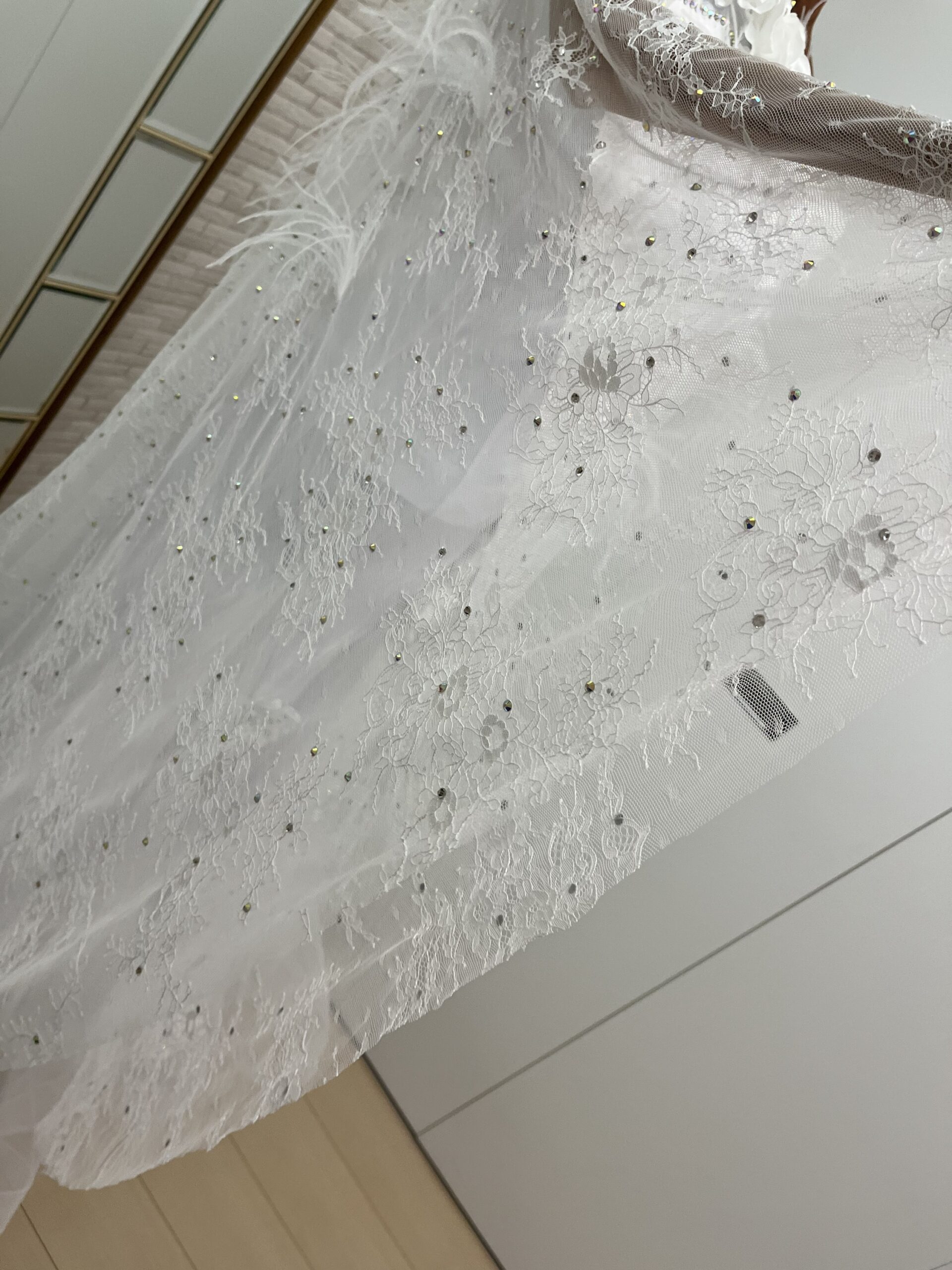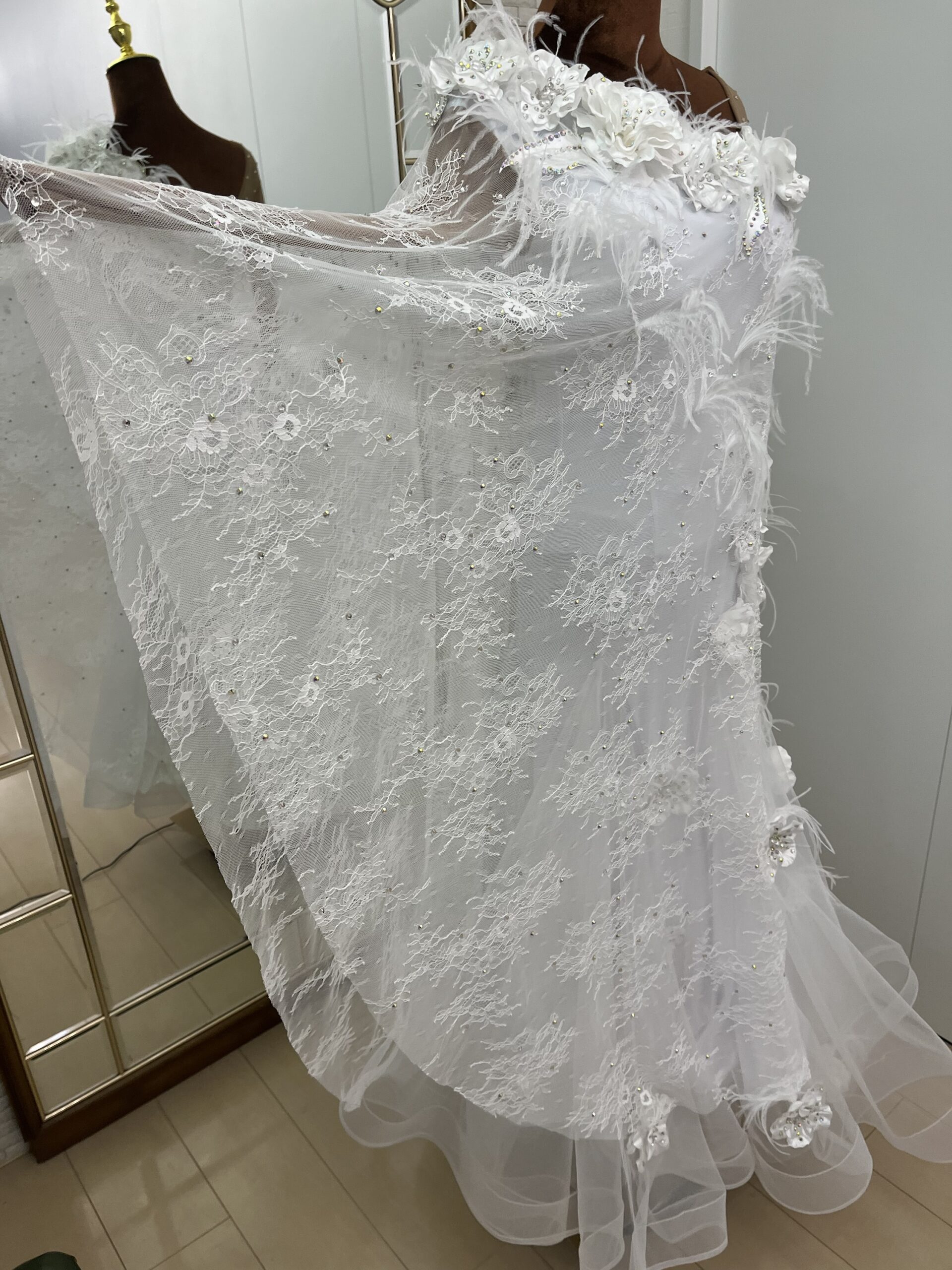 繊細なレースと羽根、そして花々が立体的に重なり、見る角度によって異なる表情を見せます。