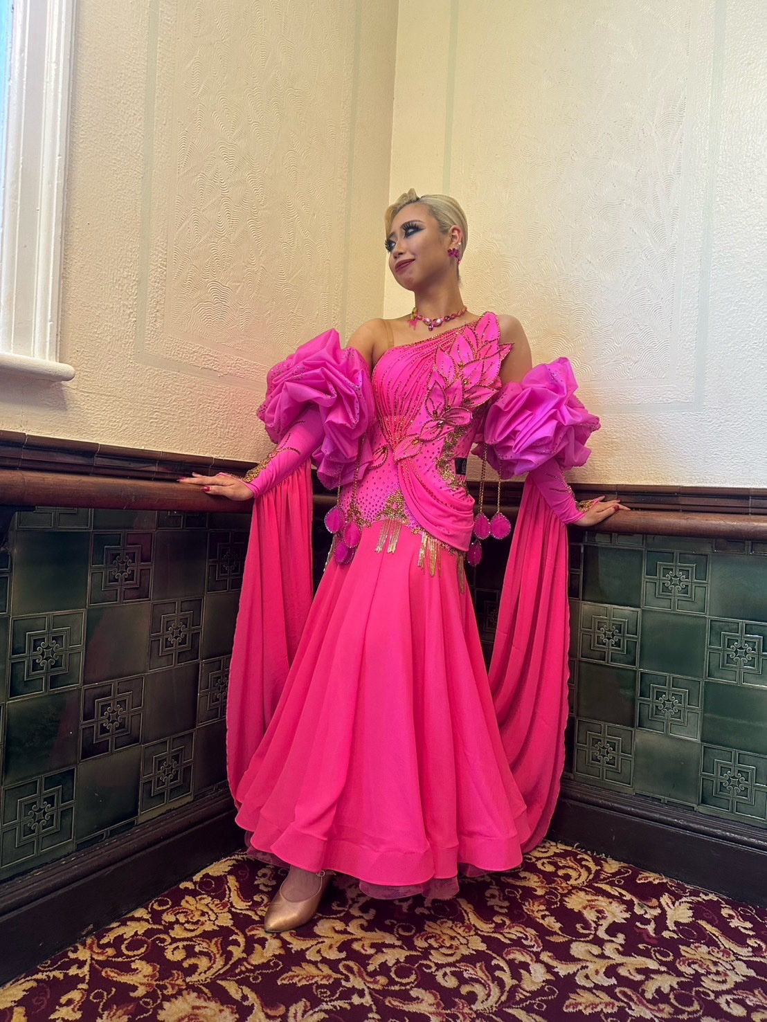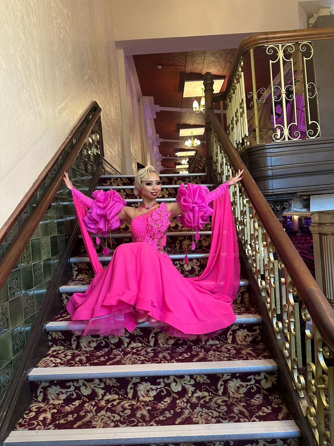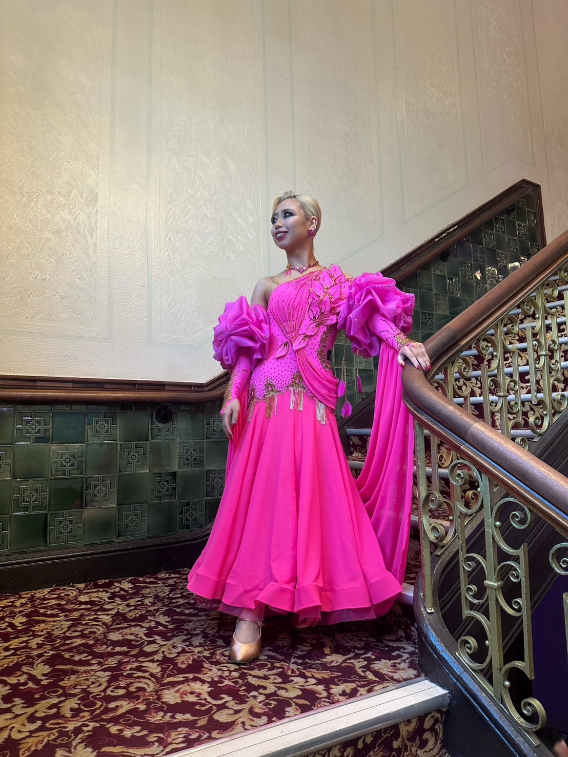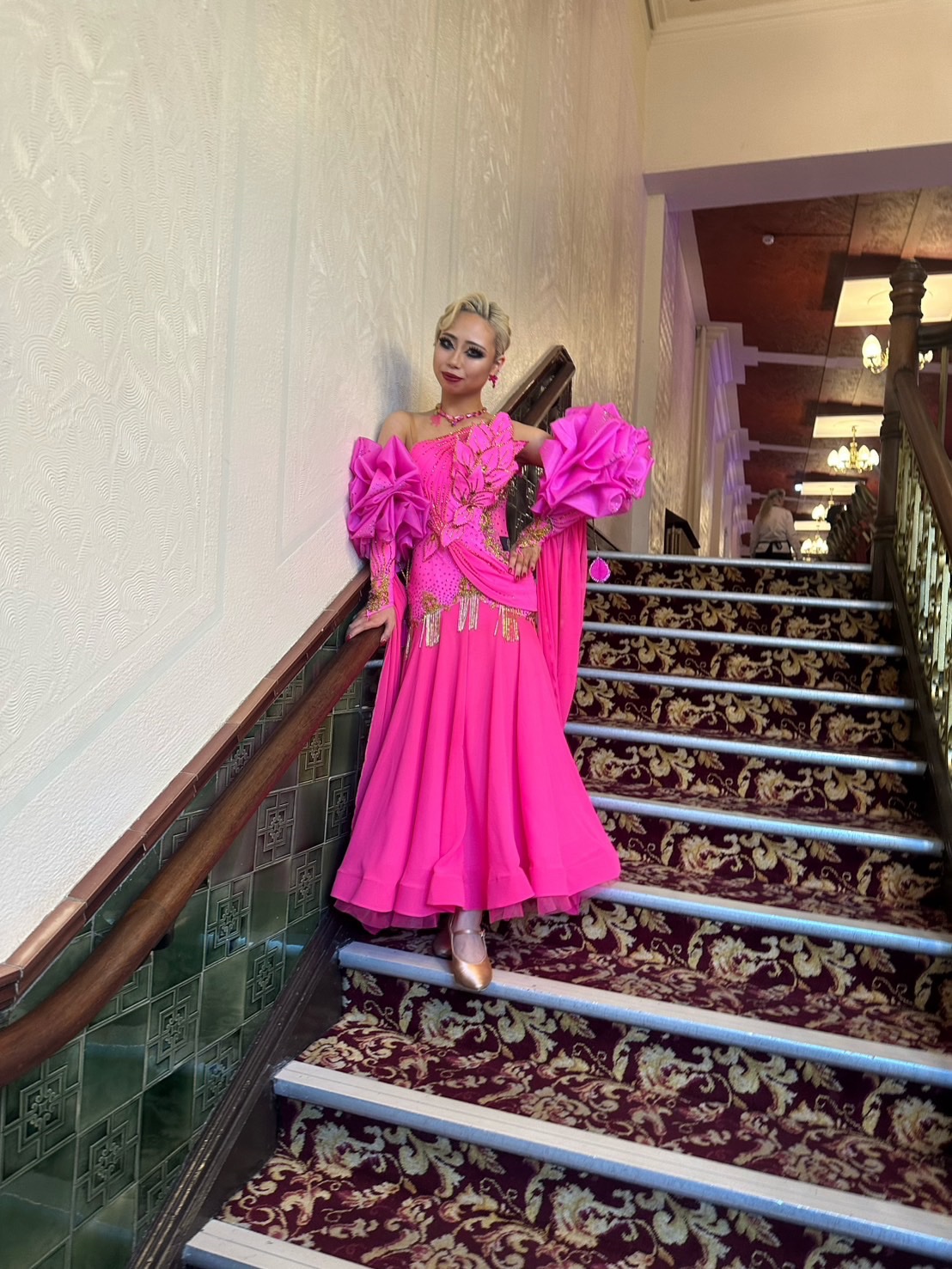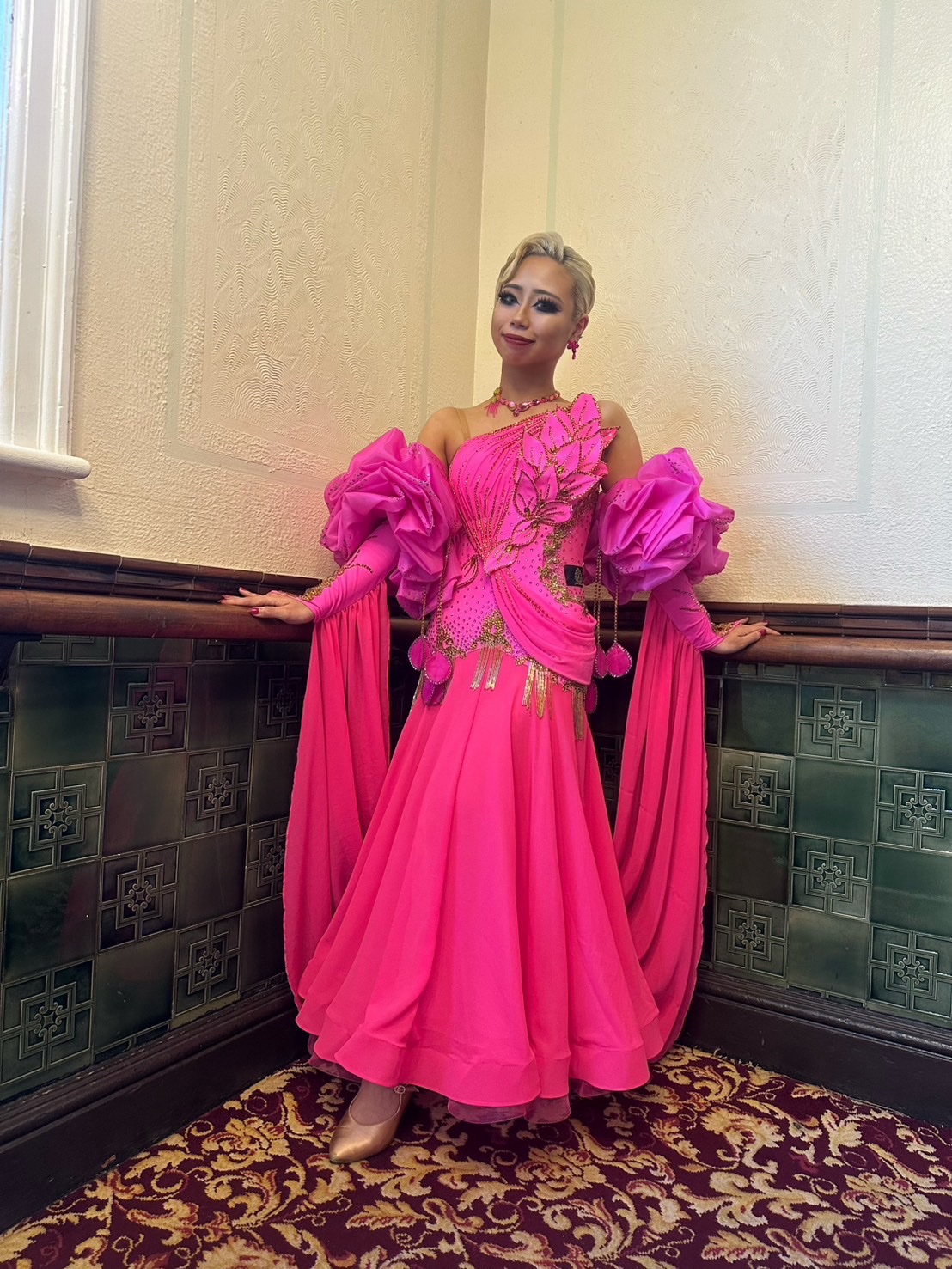 燃えるようなピンクと黄金のラインが、ステージに花を咲かせる一着。
