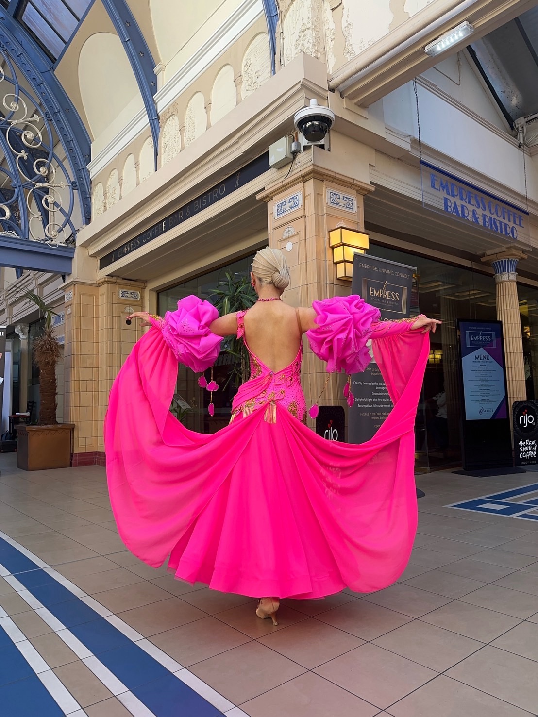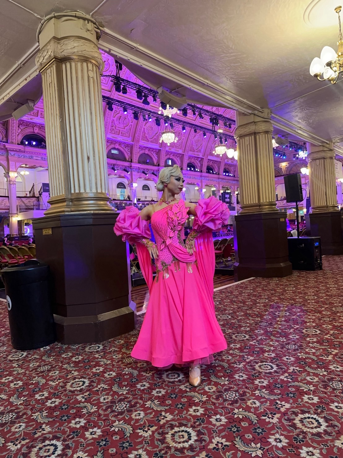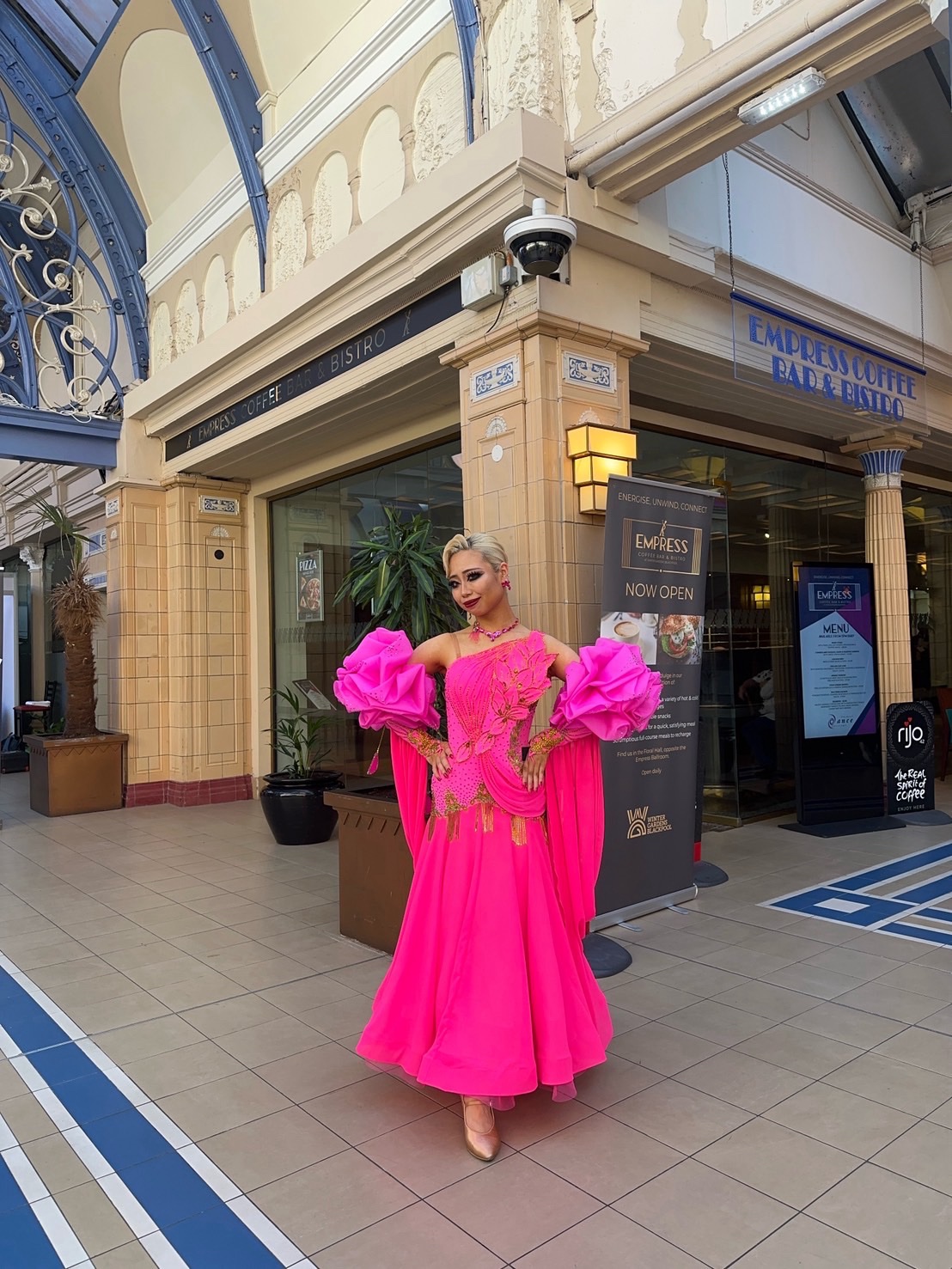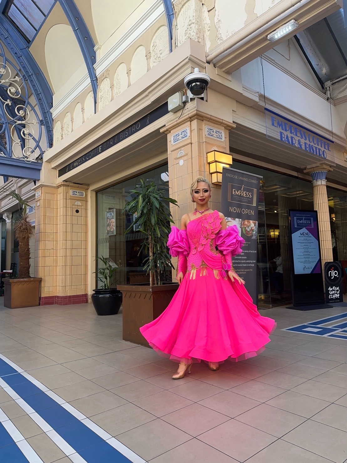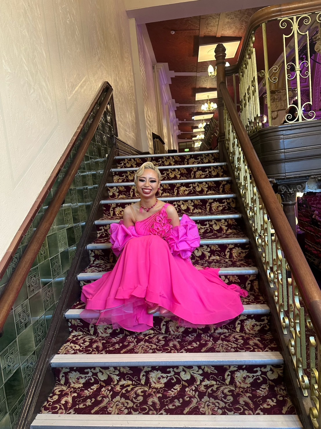燃えるようなピンクと黄金のラインが、ステージに花を咲かせる一着。